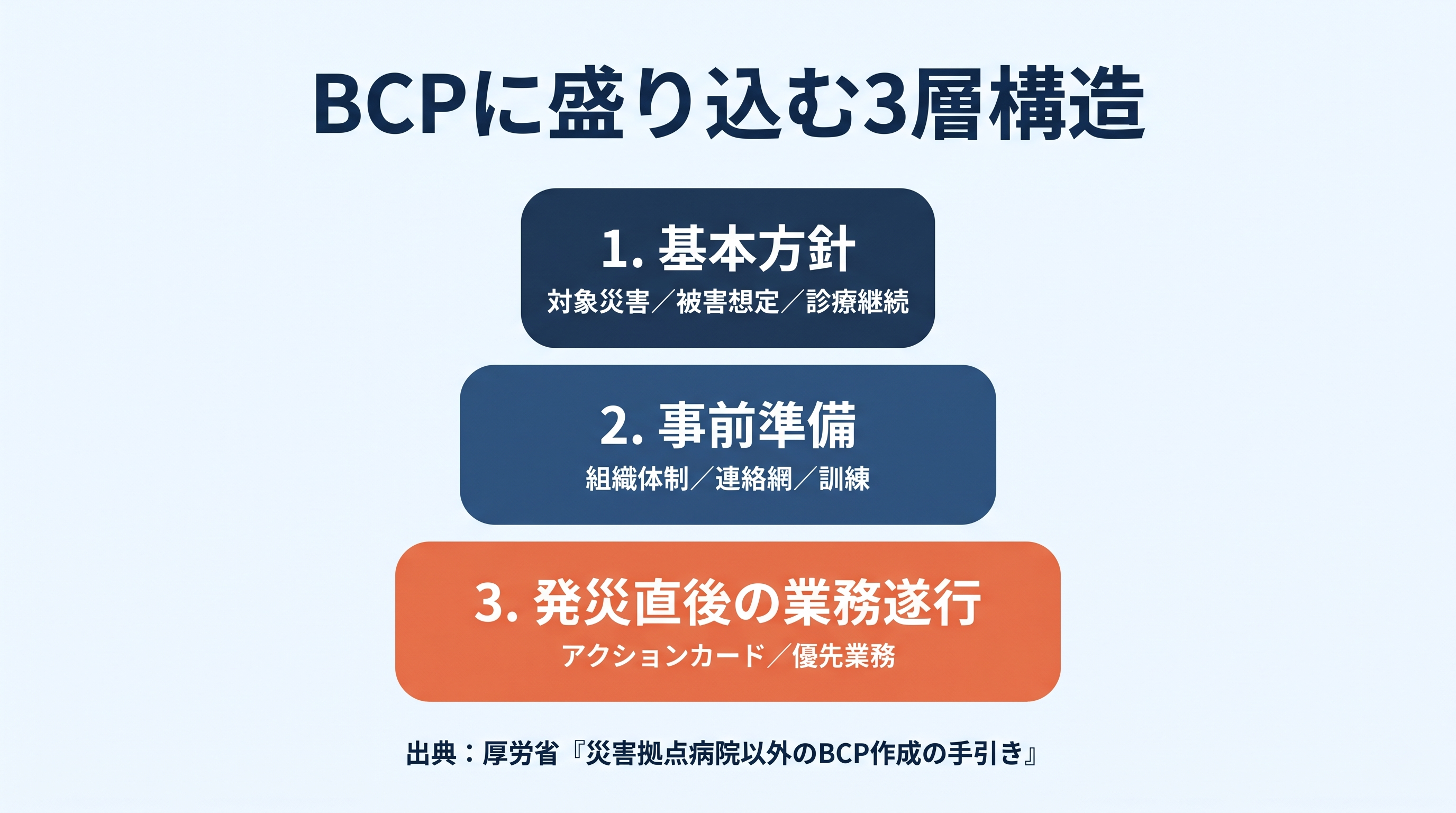 - 事前準備 — 災害対応組織体制、本部機能、優先業務設定、診療情報維持体制、外部機関との連絡体制、スタッフ教育・訓練、避難計画、受援計画、遺体・遺族対応、BCP維持管理体制