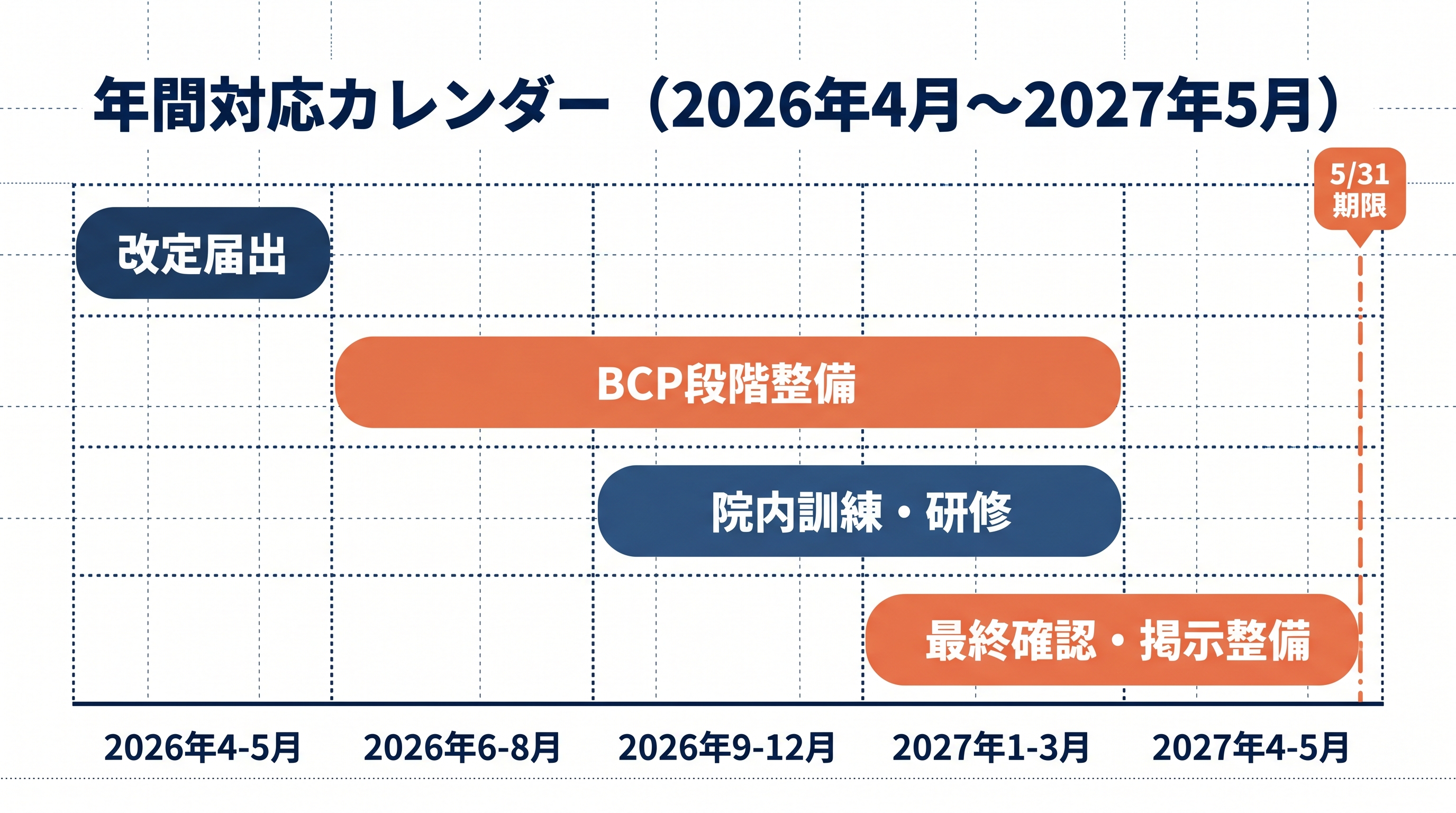 経過措置を逆算して年間タスクに落とし込んだイメージです(自院の届出状況に応じて調整してください)。