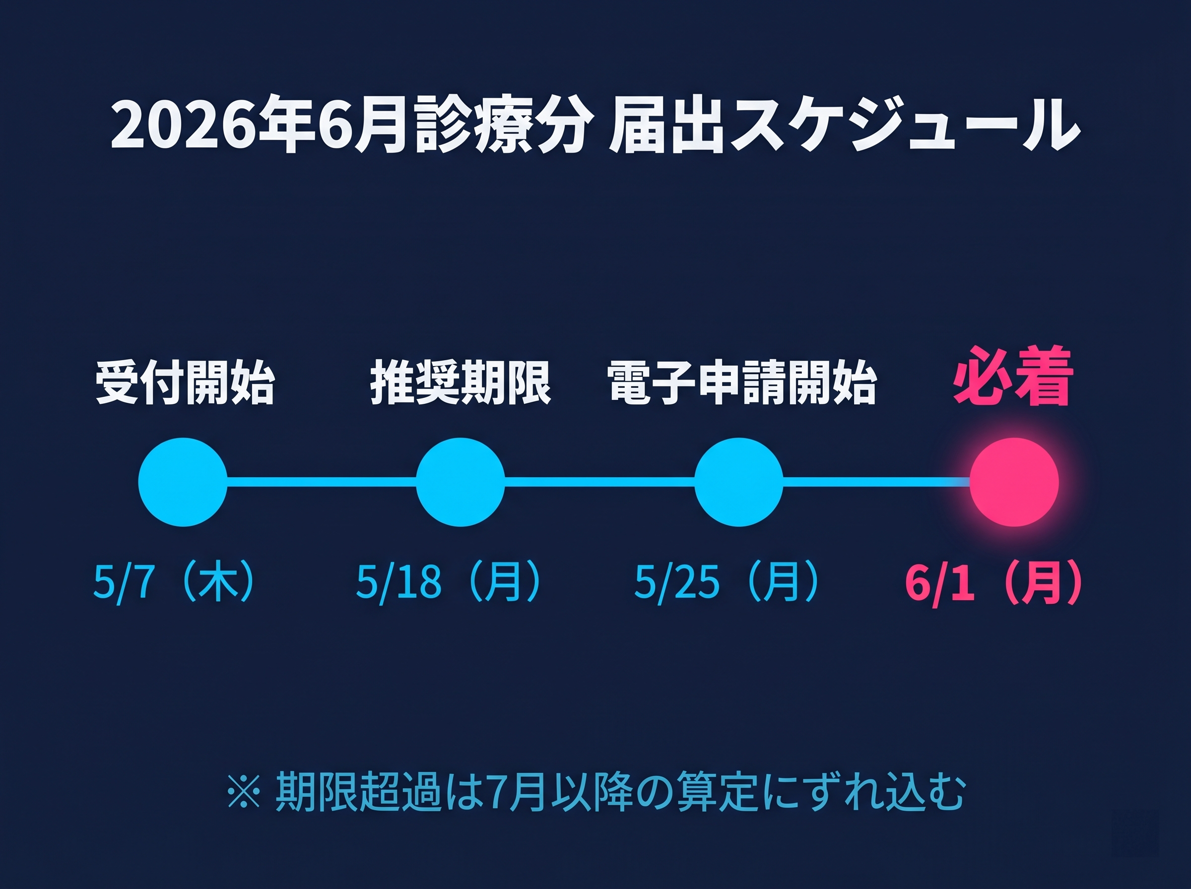 同じ事務連絡では、「令和8年5月下旬以降に地方厚生(支)局等の窓口は届出が集中し、混雑が予想されることから、可能な限り令和8年5月18日までの届出に努めること」とされています。また、電子申請は5月25日から受付開始 とされているため、書面提出の医療機関と電子申請の医療機関で提出タイミングが並ぶ点も意識しておくと良いでしょう。