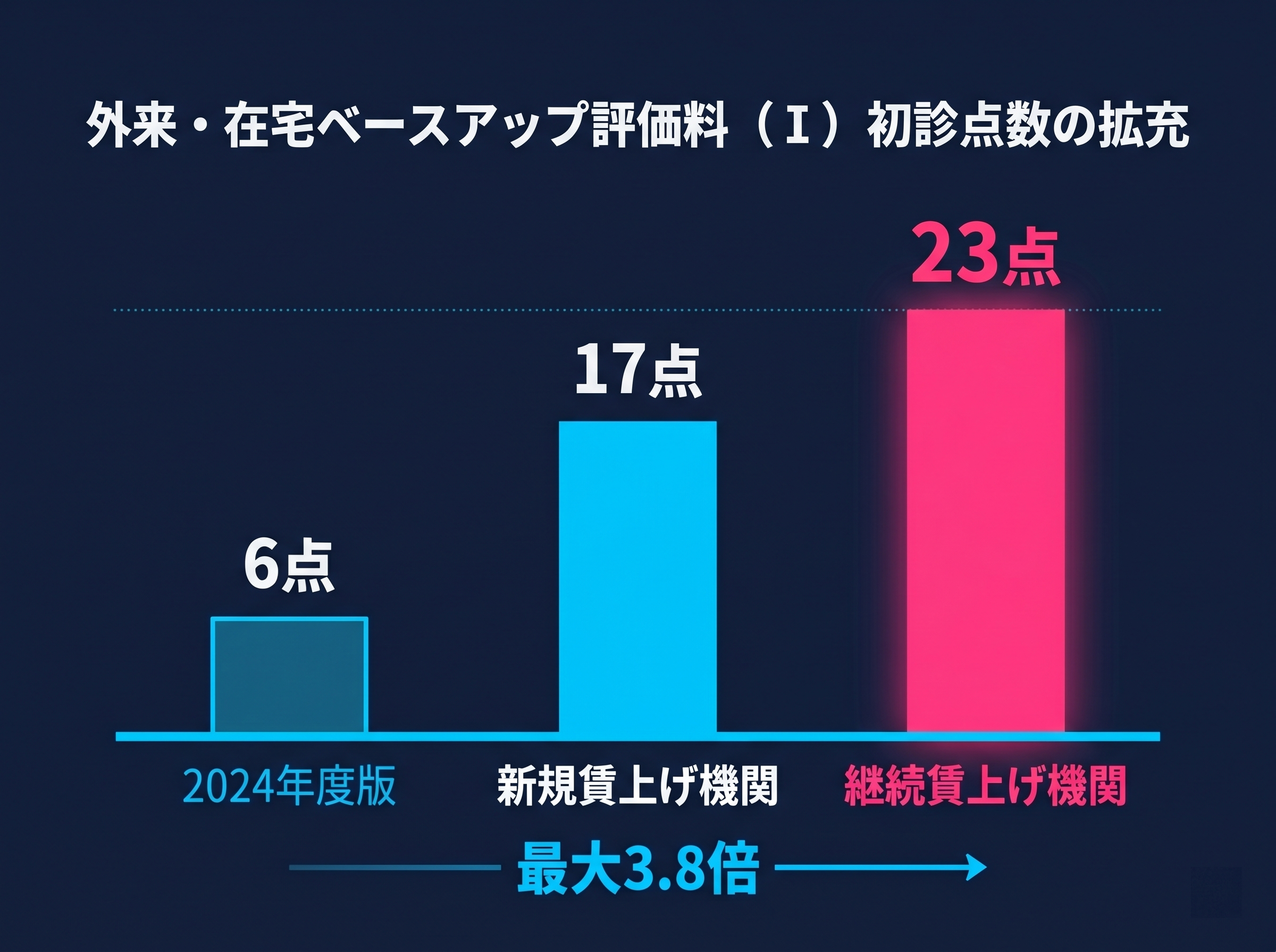 改定前(2024年度版)は初診6点・再診2点・訪問28点だったため、初診で 新規17点(約2.8倍)/継続23点(約3.8倍) と最大約3.8倍の拡充となります。
