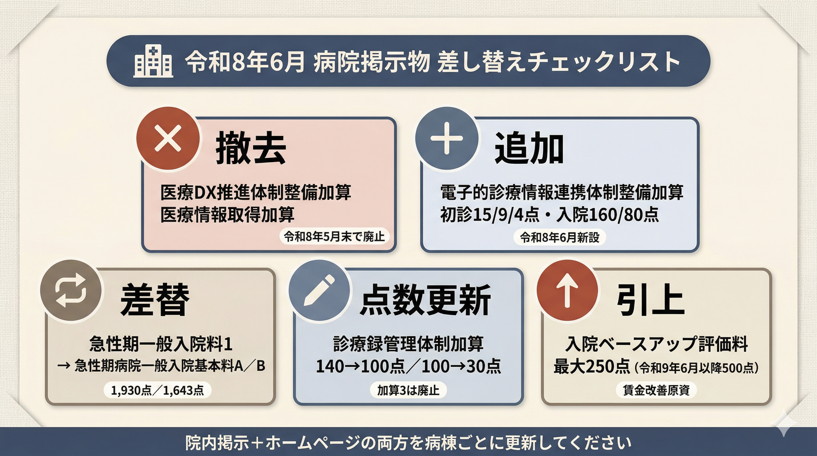 令和8年6月の改定では、医療DX推進体制整備加算の廃止、電子的診療情報連携体制整備加算の新設、急性期病院一般入院基本料A/Bの新設、診療録管理体制加算の点数見直し、入院ベースアップ評価料の大幅引上げと、病院の掲示物は過去10年でも最大規模の差し替えになります。適時調査では「届出事項と院内掲示が一致していない」「病棟別の看護配置が掲示されていない」「ウェブサイト掲載が漏れている」が頻出指摘事項です。