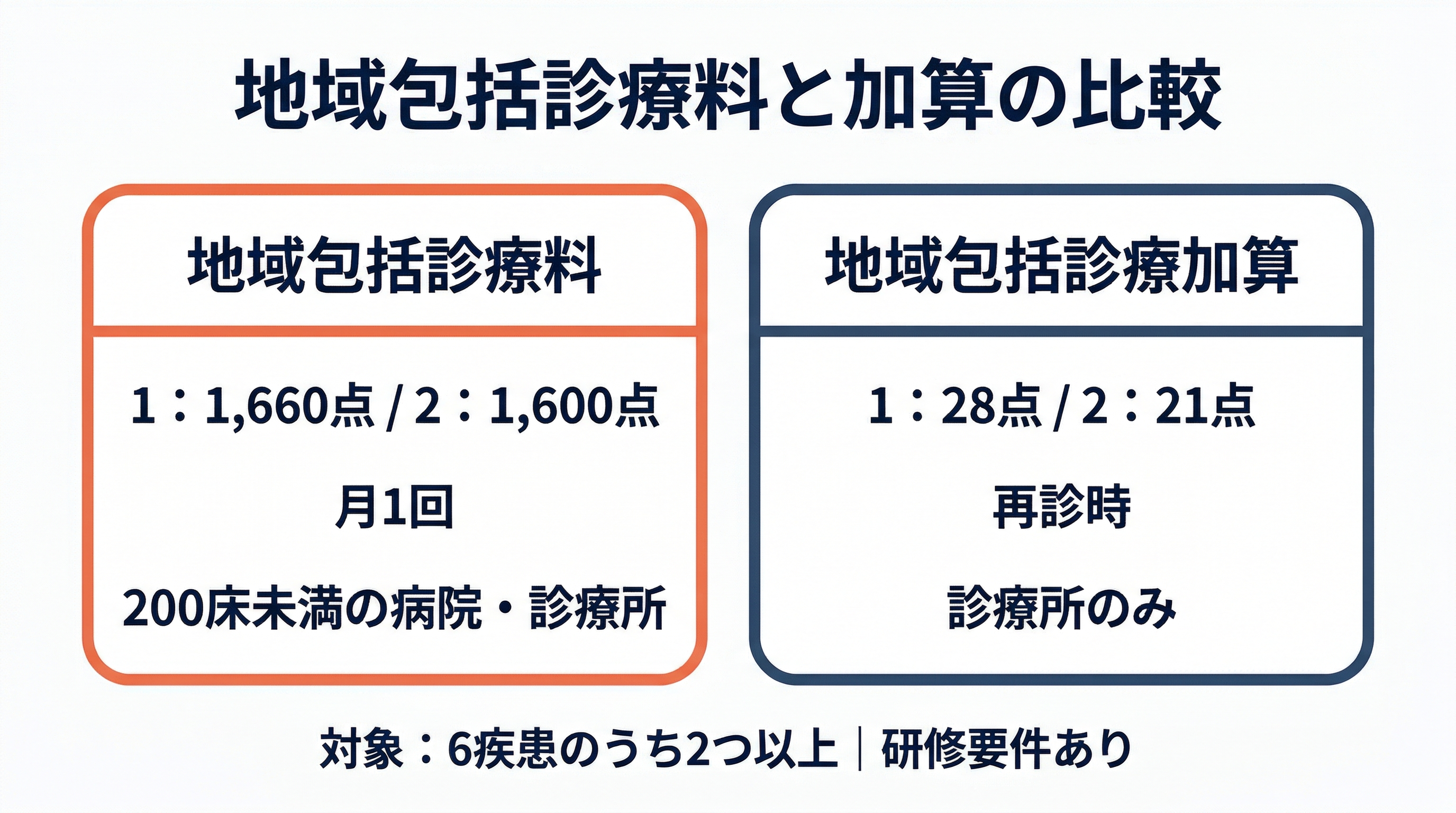 地域包括診療料と地域包括診療加算は、複数の慢性疾患を持つ患者に対するかかりつけ医機能を評価する点数です。名前が似ているため混同しやすいですが、点数体系や対象医療機関が異なります。