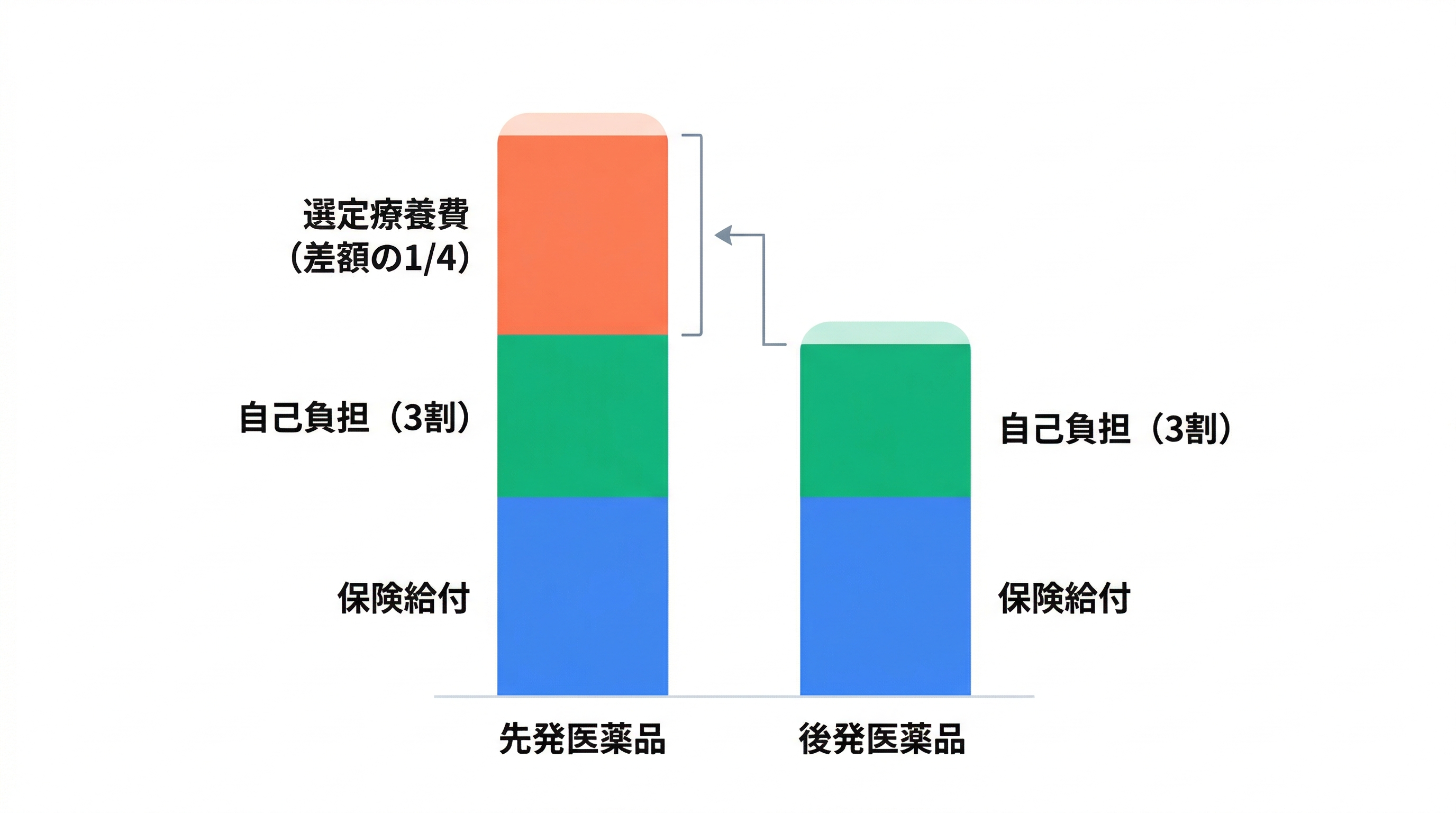 - 患者希望で先発品を選んだ場合、後発品との価格差の1/2が追加負担になる(令和8年6月〜。制度開始時は1/4)
