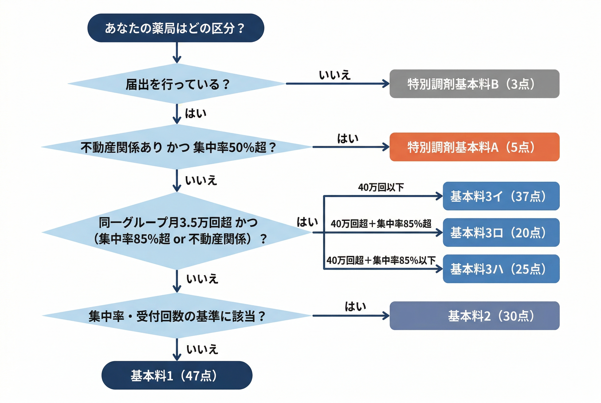 調剤基本料2・3および特別調剤基本料Aのいずれにも該当しない薬局が対象です。つまり、特別な要件に当てはまらない一般的な薬局は、最も高い47点を算定できます。