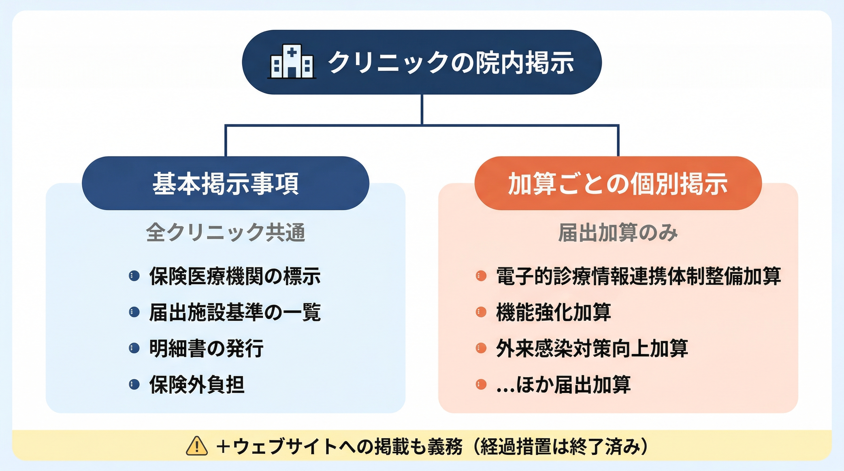 基本掲示事項は全クリニックに必要です。加算ごとの個別掲示は、届出ている加算だけ掲示すれば問題ありません。