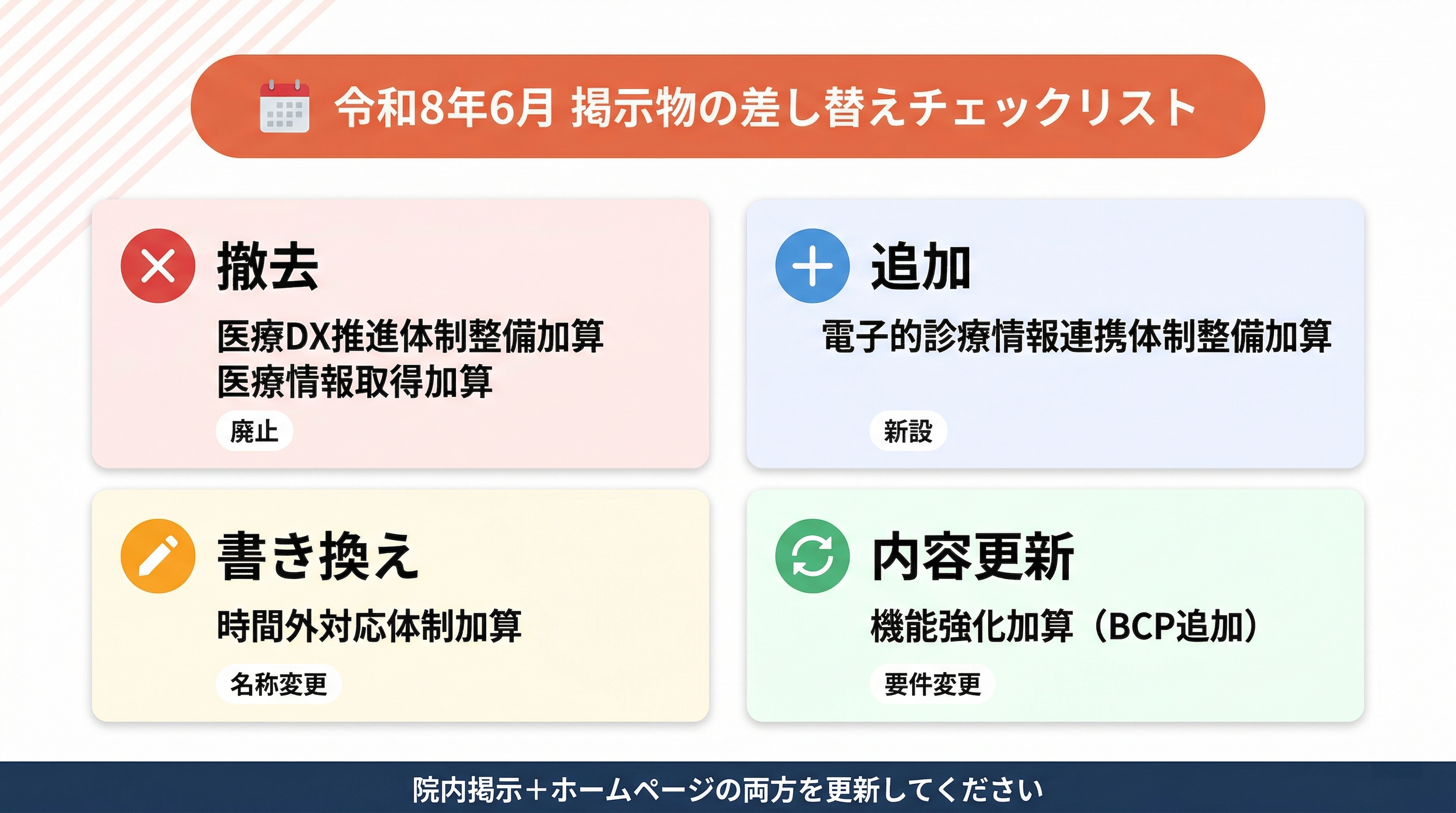 | 廃止 | 医療DX推進体制整備加算、医療情報取得加算 → 掲示物の撤去が必要 |