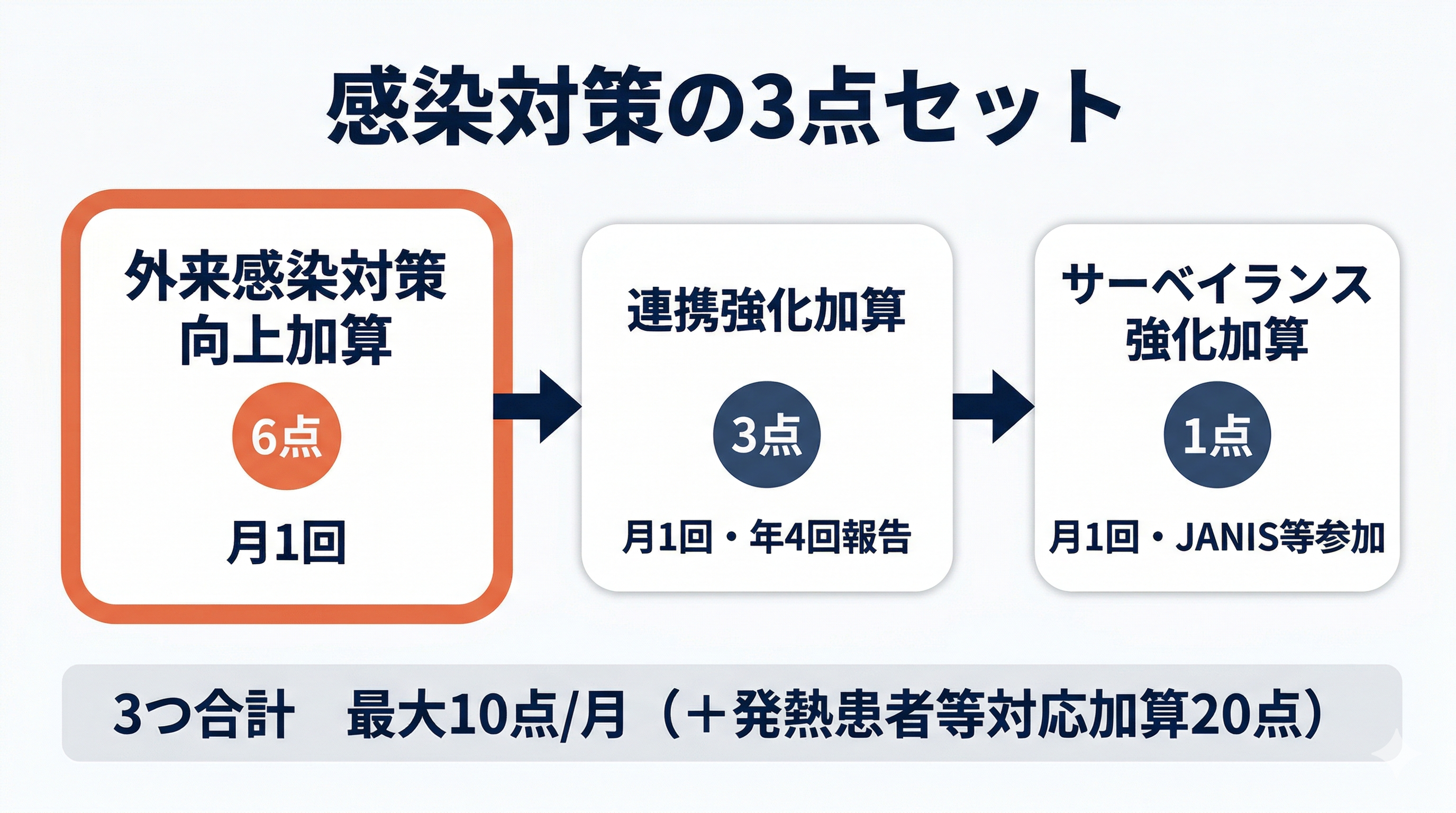 外来感染対策向上加算(6点)と合わせると、月に最大26点を算定できます。