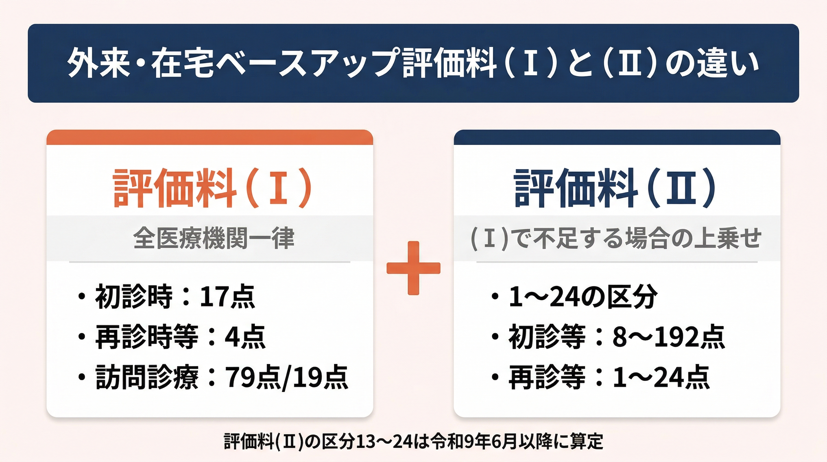 外来・在宅ベースアップ評価料には(Ⅰ)と(Ⅱ)の2種類があります。