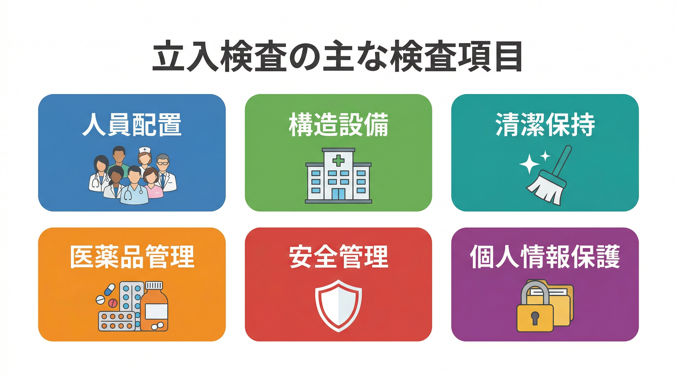 - 検査項目は人員配置・構造設備・清潔保持・医薬品管理・安全管理・感染対策・個人情報保護など多岐にわたる