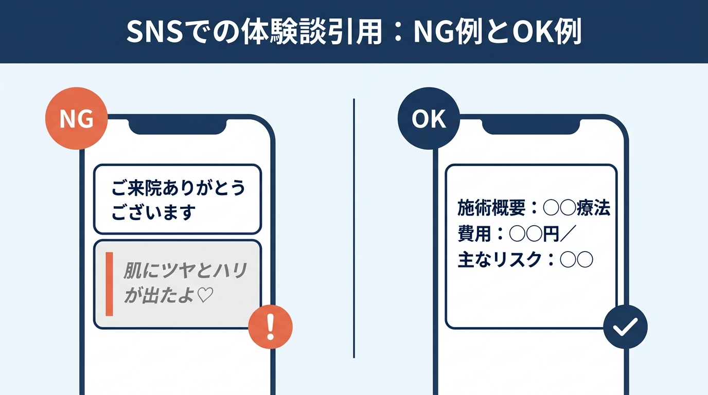 「他者の投稿を引用することで、自院のサービス等の体験談を紹介している場合も違反」と明記されています(医療法第6条の5第2項第4号、医療法施行規則第1条の9第1号)。動画でも同様で、患者がリスク・副作用を語っている場合も「体験談」とみなされます。