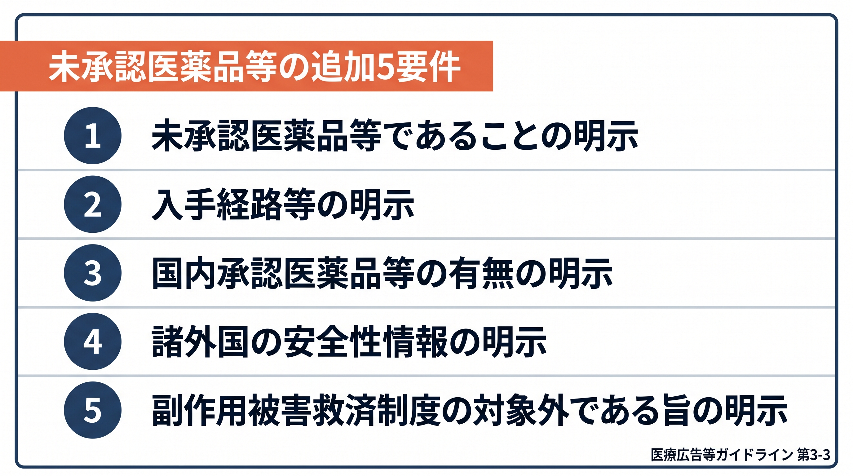 これらは医療法施行規則第1条の9の2に基づく未承認医薬品等の追加5要件を具体化したもので、(ⅰ)未承認である旨、(ⅱ)入手経路、(ⅲ)国内承認医薬品の有無、(ⅳ)諸外国の安全性情報、(ⅴ)救済制度対象外、を「十分に記載」する必要があります。