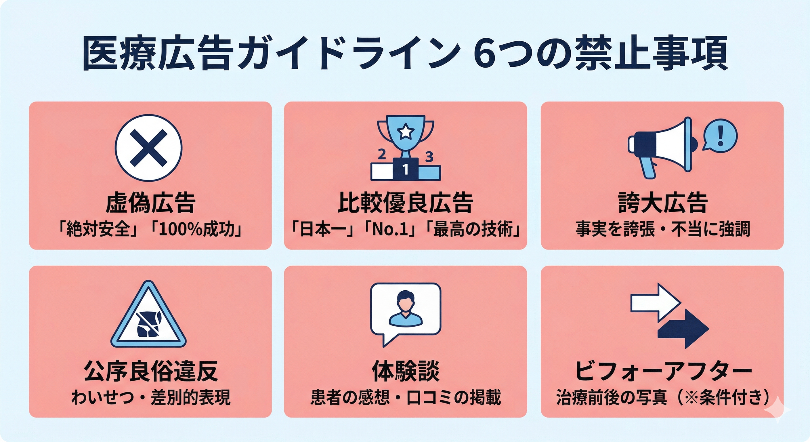 - 6つの禁止事項(虚偽・比較優良・誇大・公序良俗違反・体験談・ビフォーアフター)はいかなる場合も禁止