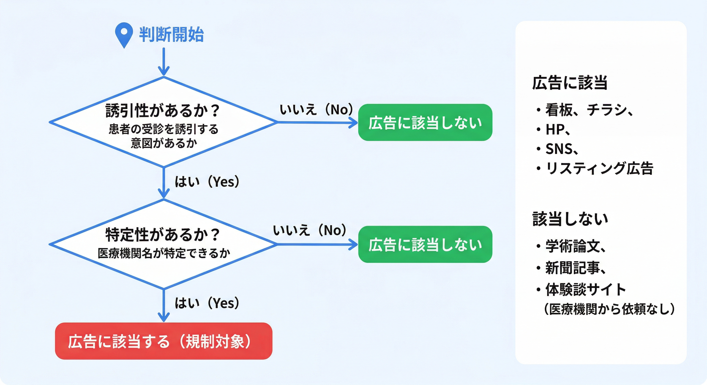たとえば、特定のクリニック名を出して「当院では最新の治療を行っています」と書けば、誘引性・特定性の両方を満たすため「広告」に該当します。