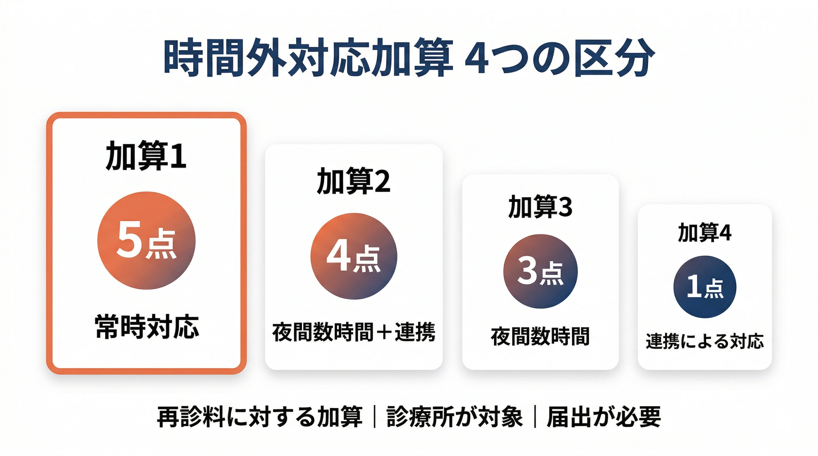| 加算2 | 4点 | 標榜時間外の夜間の数時間に対応+連携診療所(最大3つ)との連携 | 当該診療所の非常勤を含む医師・看護職員・事務職員等 |