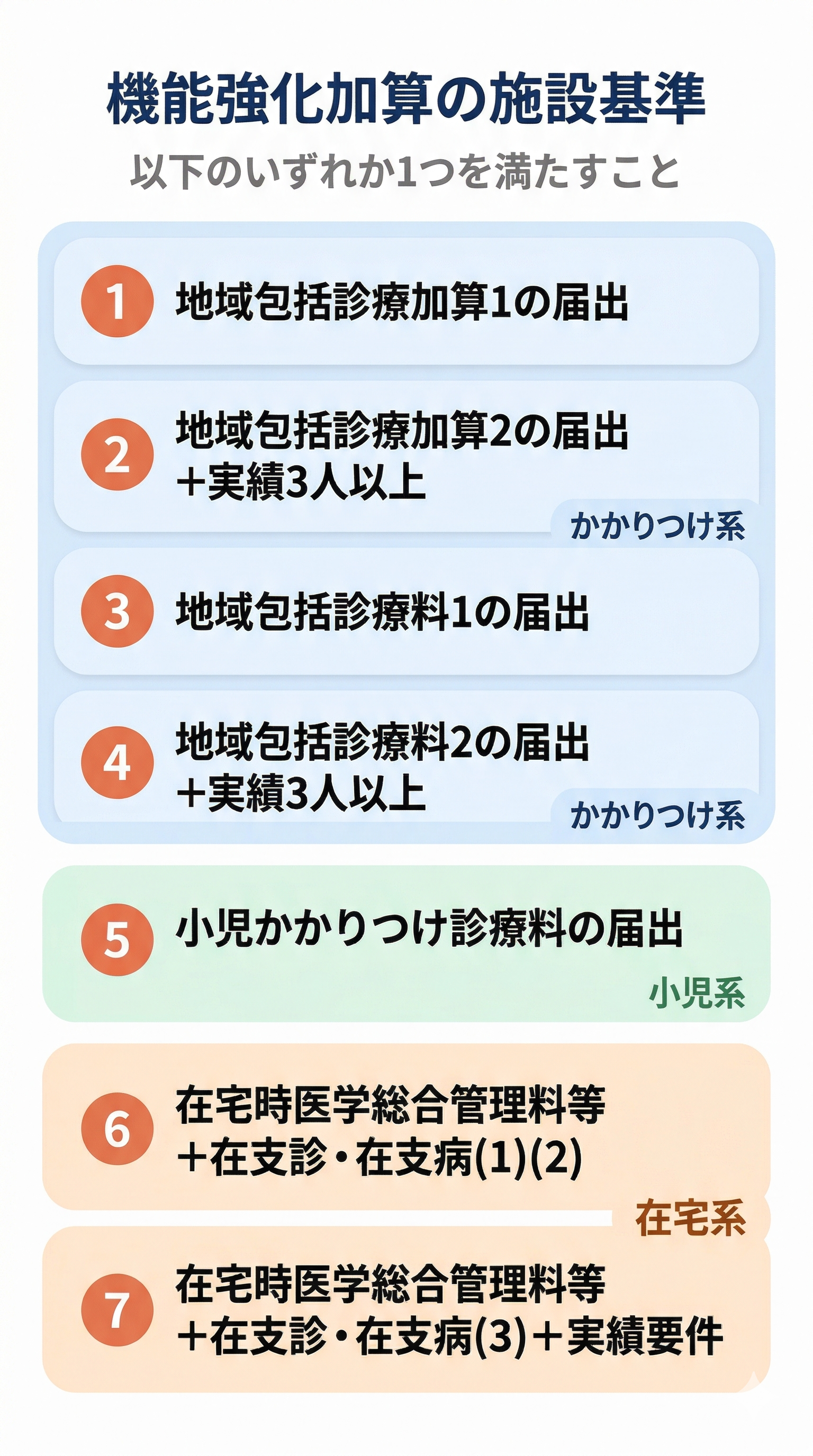 機能強化加算の施設基準で最も重要なのは、以下の7つの要件のうち、いずれか1つを満たしていることです。