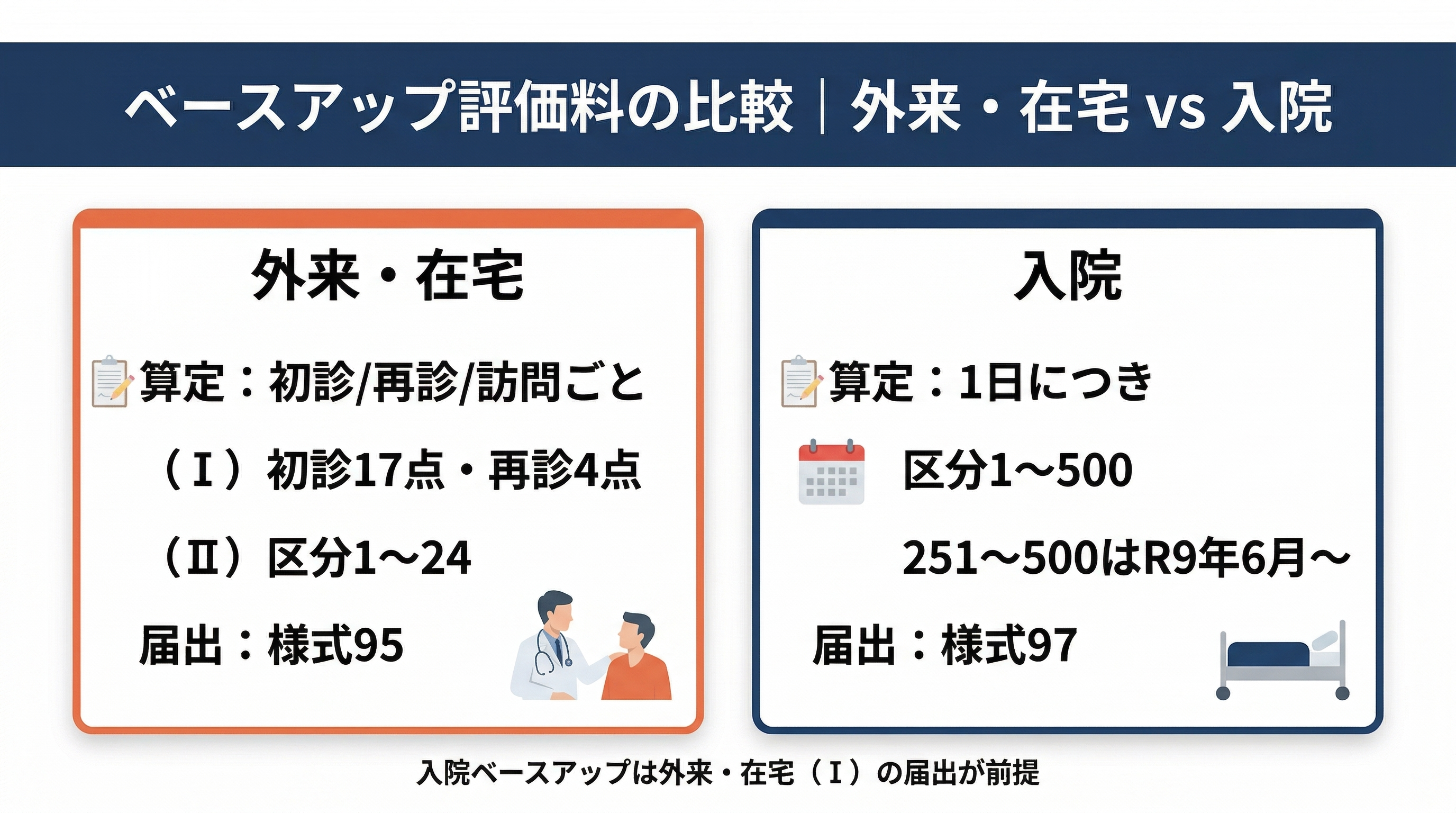 が初診・再診・訪問診療ごとに算定するのに対し、入院ベースアップ評価料は入院中の患者に対して毎日算定する仕組みです。