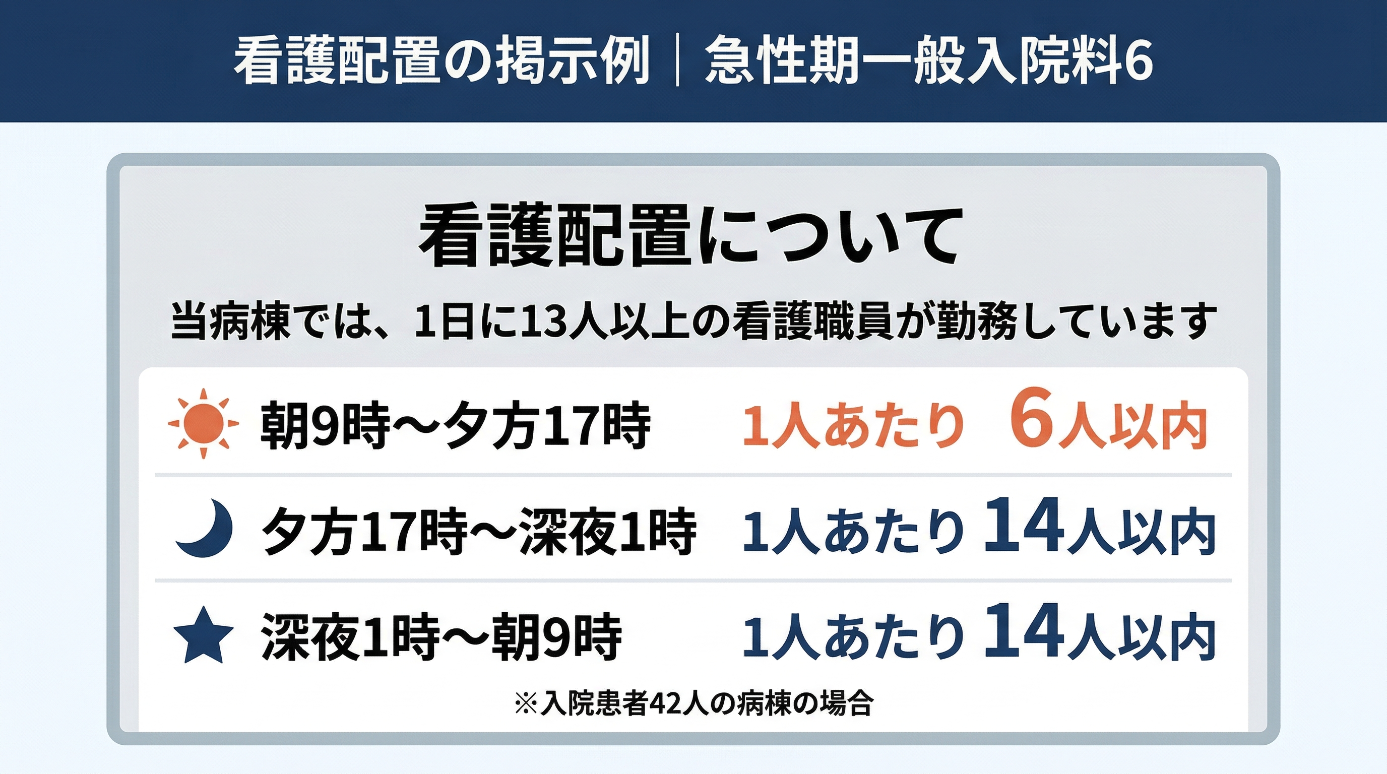 - 看護配置の掲示:各勤務帯で看護職員1人あたりの受け持ち患者数を病棟ごとに掲示