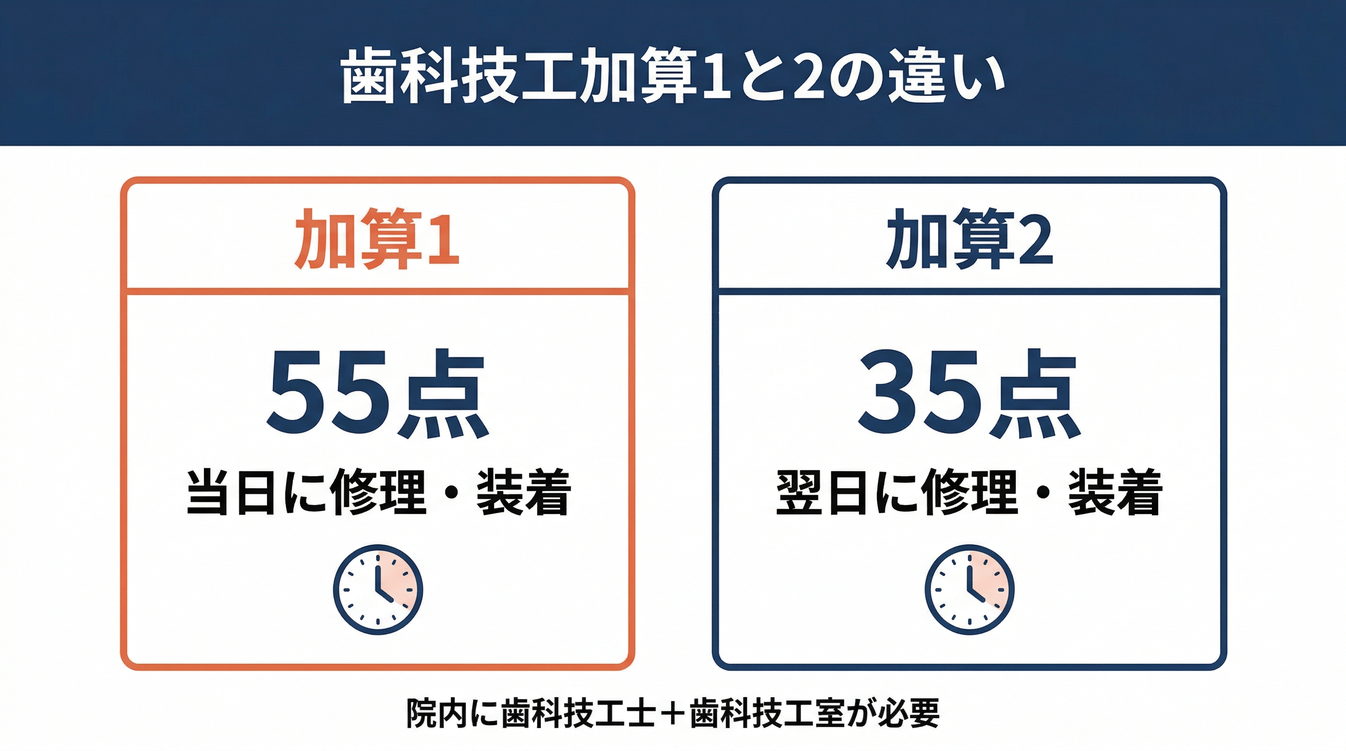 - 歯科技工加算の算定 — 加算1(55点)・加算2(35点)を算定可能