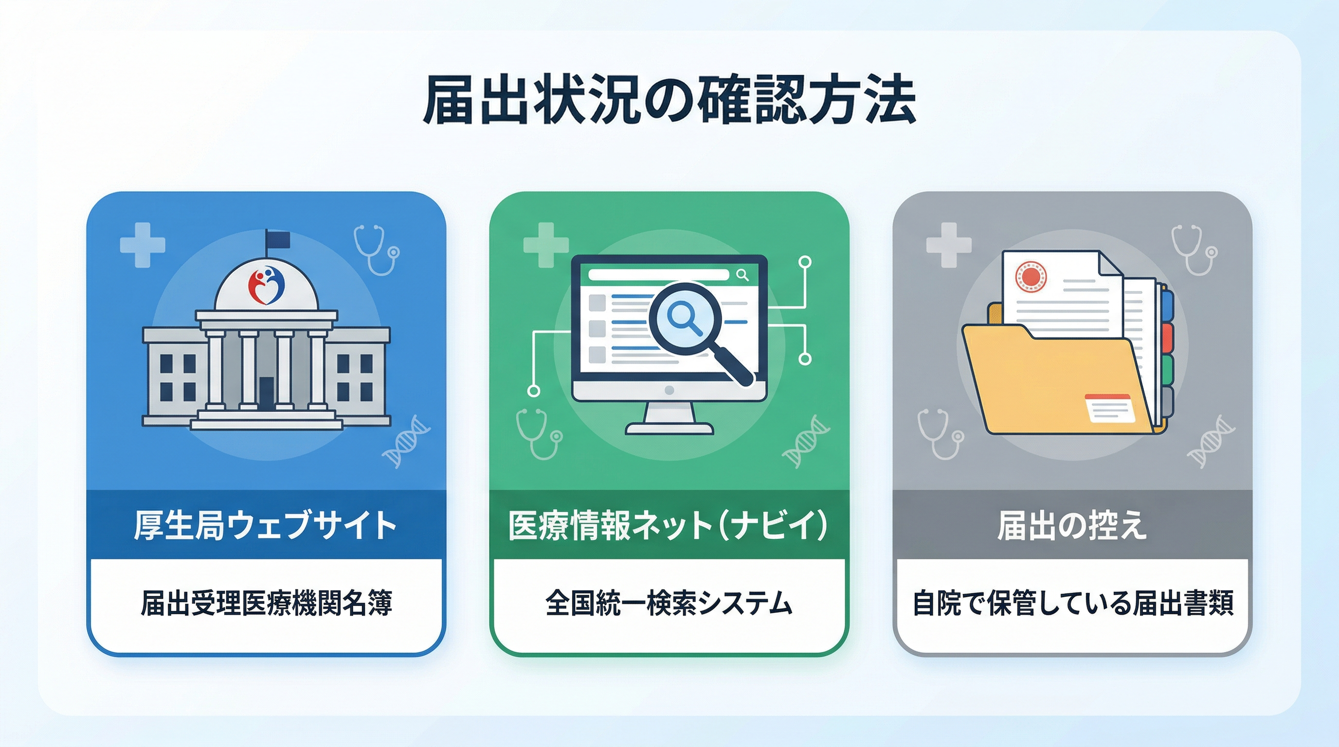 - 3つの確認方法: 厚生局ウェブサイト(推奨)・医療情報ネット(ナビイ)・届出の控え