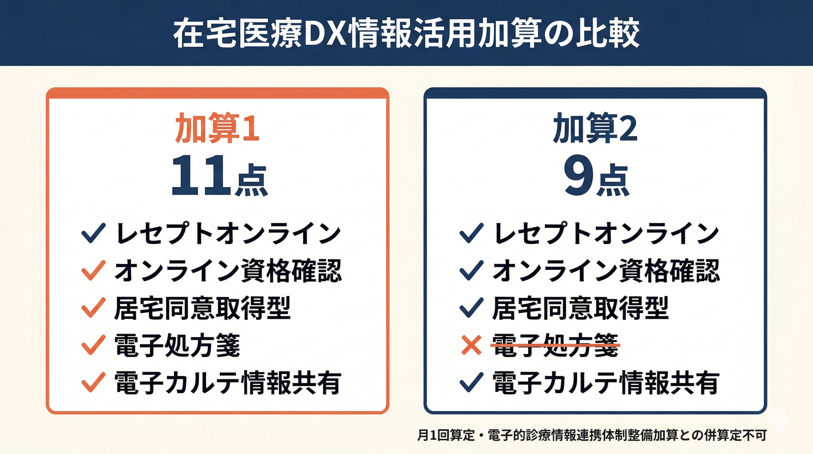 が初診料・再診料に加算されるのに対し、在宅医療DX情報活用加算は訪問診療料に加算される点が異なります。